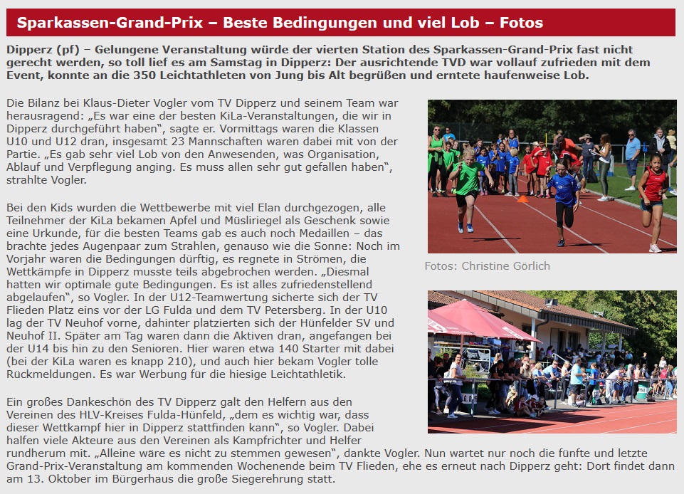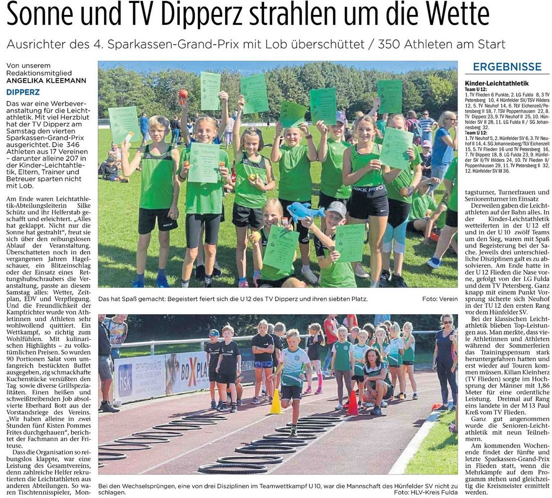 Die diesjährige Sparkassen-Grand-Prix-Saison der Leichtathleten neigt sich dem Ende zu: Das vierte und vorletzte Meeting richtete am heutigen Samstag der TV Dipperz auf seiner Sportanlage am Lindenweg aus. Und im Gegensatz zum vergangenen Jahr gab es so richtig gutes Leichtathletikwetter.