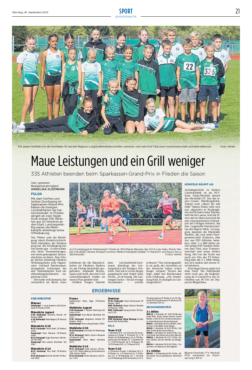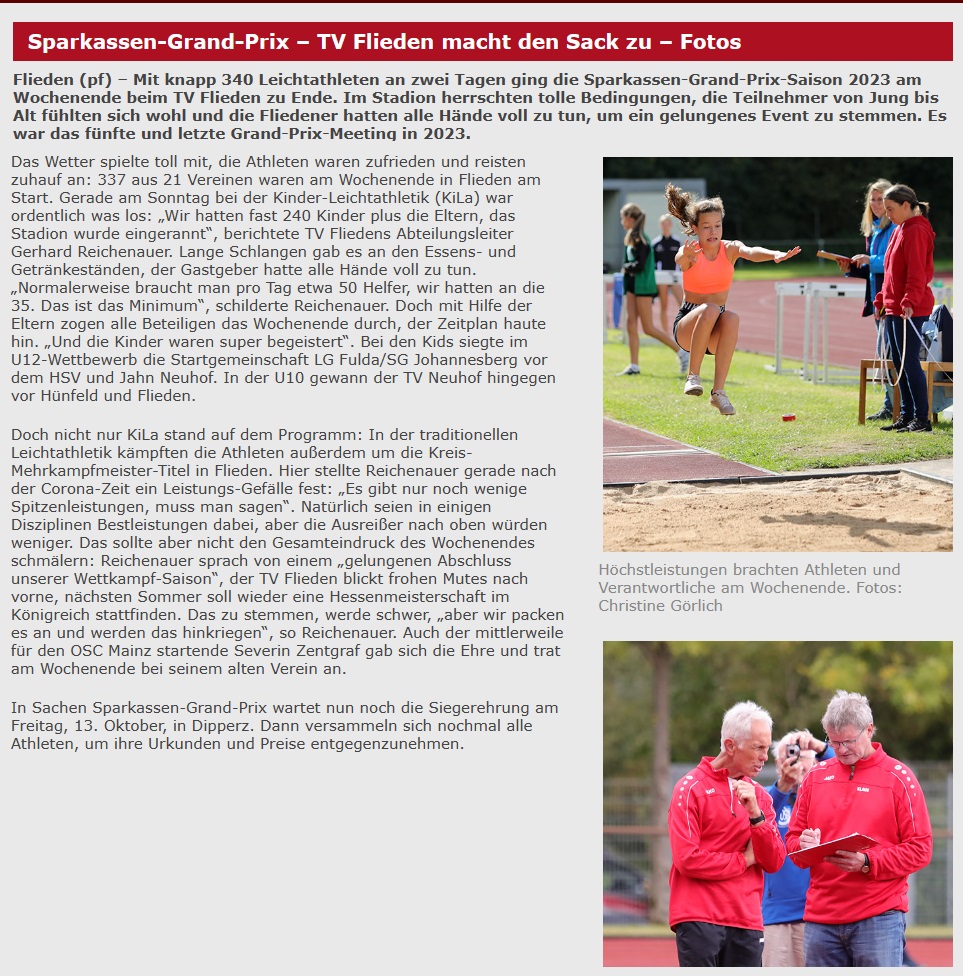 Mit dem 5. Sparkassen-Grand-Prix 2023 in Flieden ist die Sparkassen-Grand-Prix-Saison der Leichtathleten im HLV-Kreis Fulda-Hünfeld zu Ende. Und was war das nochmal für ein Leichtathletik-Event bei richtig gutem Leichtathletik-Wetter. Über 2 Tage verteilt waren 335 Athleten aus 20 Vereinen am Start.