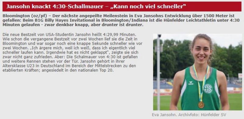 Der nächste angepeilte Meilenstein in Eva Jansohns Entwicklung über 1.500m, unter 4:30 Minuten zu laufen, ist geschafft! Zwar denkbar knapp, aber drunter ist drunter.