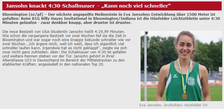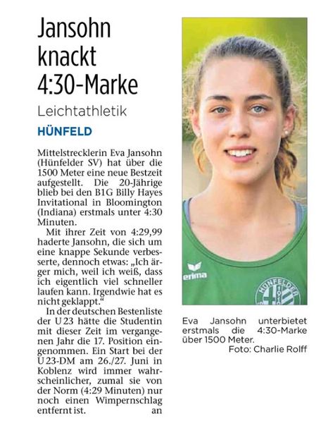 B1G Billy Hayes Invitational, Bloomington, Indiana; neue Bestzeit für Eva Jansohn über 1.500m; erstmals unter 4:30 Minuten