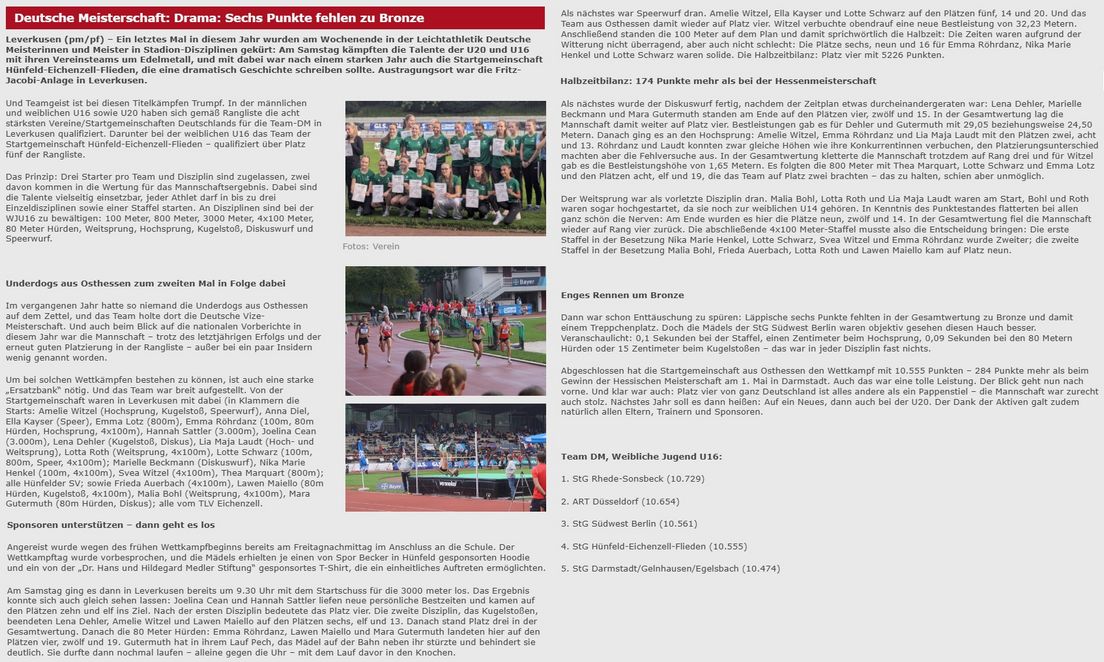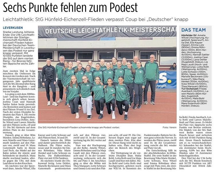 Teamgeist ist bei diesen Titelkämpfen Trumpf. In der männlichen und weiblichen U16 sowie U20 haben sich gemäß Rangliste die acht stärksten Vereine/Startgemeinschaften Deutschlands für die Team-DM in Leverkusen qualifiziert. Darunter bei der weiblichen U16 das Team der Startgemeinschaft Hünfeld-Eichenzell-Flieden – qualifiziert über Platz 5 der Rangliste.