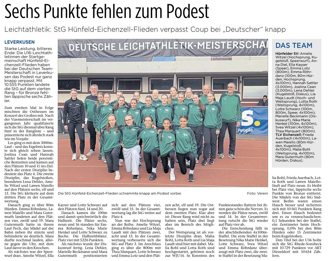 - Amelie Witzel (Hochsprung, Kugelstoß, Speerwurf), Anna Diel, Ella Kayser (Speer), Emma Lotz (800m), Emma Röhrdanz (100m, 80m Hürden, Hochsprung, 4x100m), Hannah Sattler (3.000m), Joelina Cean (3.000m), Lena Dehler (Kugelstoß, Diskus), Lia Maja Laudt (Hoch- und Weitsprung), Lotta Roth (Weitsprung, 4x100m), Lotte Schwarz (100m, 800m, Speer, 4x100m); Marielle Beckmann (Diskuswurf), Nika Marie Henkel (100m, 4x100m), Svea Witzel (4x100m), Thea Marquart (800m); alle Hünfelder SV