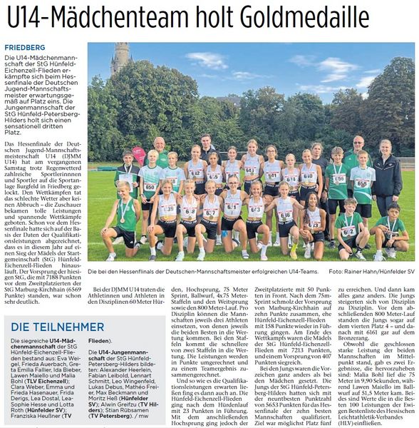 Schon vor dem Hessenfinale der Deutschen Jugend-Mannschaftsmeisterschaft U14 (DJMM U14) hatte sich auf der Basis der Daten der Qualifikationsleistungen abgezeichnet, dass es in diesem Jahr auf einen Sieg der Mädels der StG Hünfeld-Eichenzell-Flieden hinausläuft. Der Vorsprung der Mädels der StG Hünfeld-Eichenzell-Flieden (7.188 Punkte) vor den Zweitplatzierten, der StG Marburg-Kirchhain (6.569 Punkte) war mit 619 Punkten schon sehr deutlich. Aber man kann sich nie sicher sein. Abgerechnet wird immer am Ende des Wettkampfs. Und im Rahmen eines Wettkampfs kann bekanntermaßen viel passieren.
