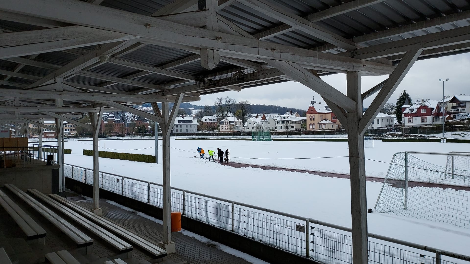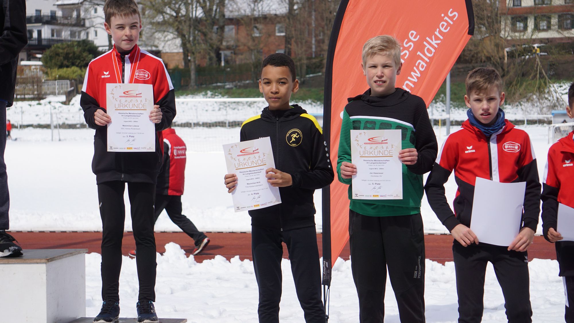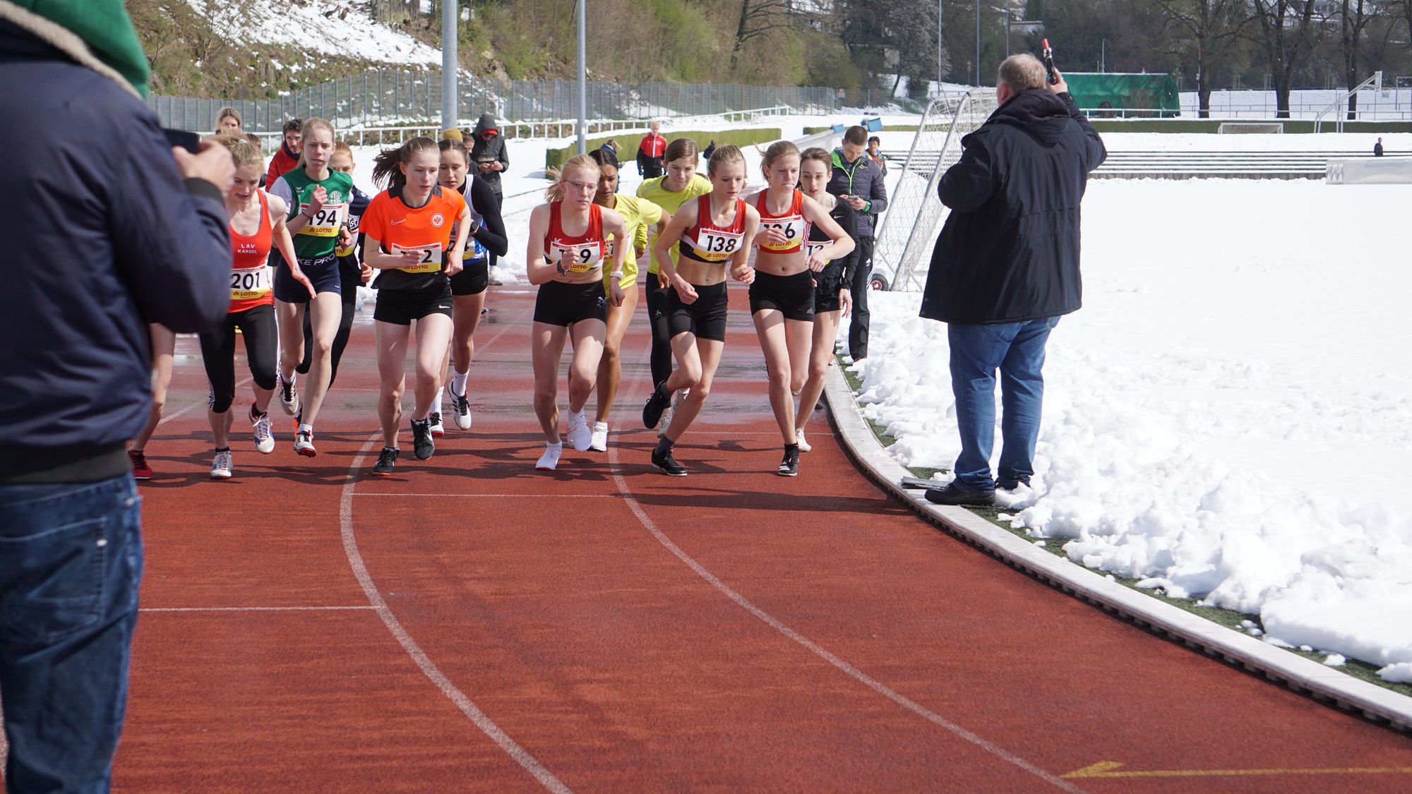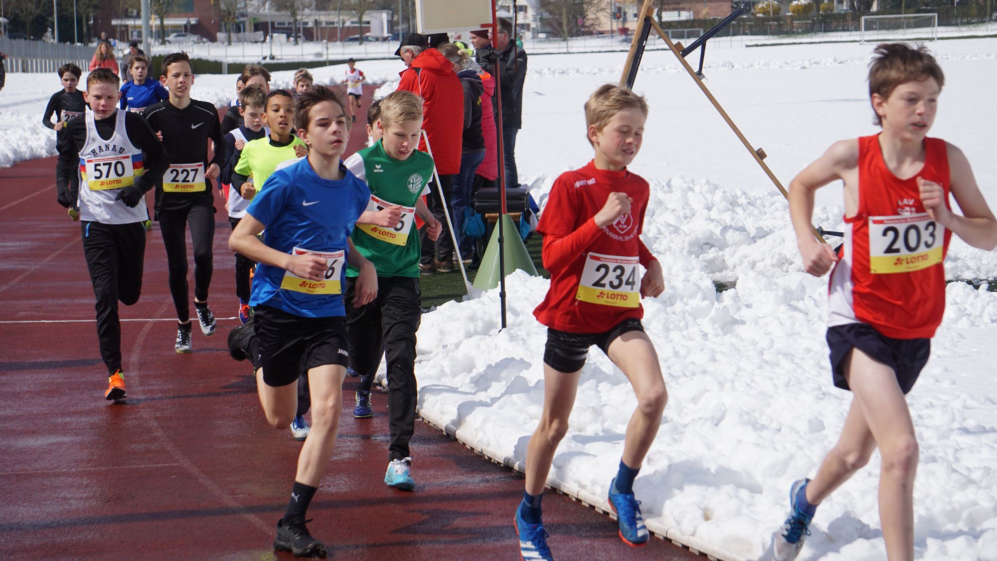 Eine geschlossene Schneedecke, Straßenglätte, umgefallene Bäume und blockierte Straßen haben dazu geführt, dass einiges nicht so lief wie es sollte! Da sah um 10 Uhr eine völlig eingeschneite Tartanbahn an der Helfer mit Schneeschiebern gerade damit begonnen hatten die Bahn freizulegen (Bild 1 in der Galerie). Und wie nicht anders zu erwarten kam es zu Verzögerungen. Erst sollte der Start statt um 11:00 Uhr um 11:10 Uhr stattfinden. Die fleißigen Helfer hatten die Bahn soweit hergerichtet, dass man darauf laufen konnte. Aber dann funktionierte auch noch die Kamera der Zeitmessanlage nicht! Schließlich konnte um 11:40 Uhr der erste Start erfolgen!