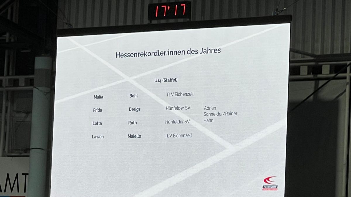 Dazu gehörten u.a. Athletinnen der weiblichen Jugend U14 der Startgemeinschaft Hünfeld-Eichenzell-Flieden, die in der Besetzung Malia Bohl, Frida Derigs, Lotta Roth, Lawen Maiello über 4 x 75m einen neuen Hessenrekord aufgestellt haben..Malia und Lawen vom TLV Eichenzell, Frida und Lotta vom Hünfelder SV.