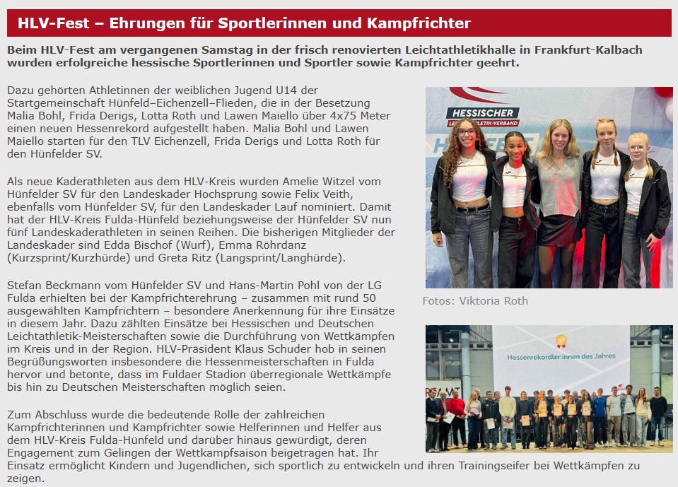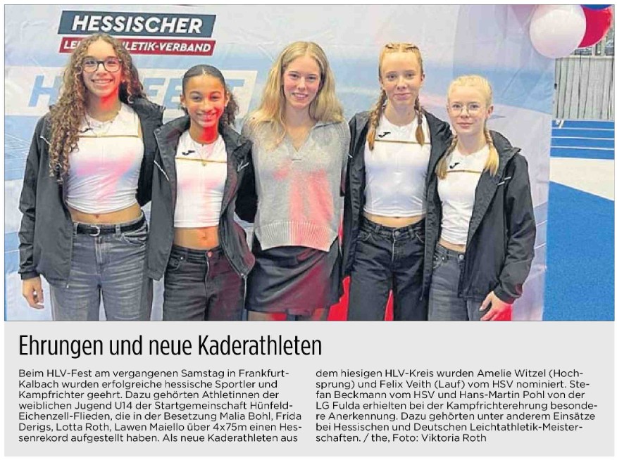Als neue Kaderathletin aus dem hiesigen HLV-Kreis wurde Amelie Witzel vom Hünfelder SV für den Landeskader Hochsprung sowie Felix Veith ebenfalls vom Hünfelder SV für den Landeskader Lauf nominiert. Damit hat der HLV-Kreis Fulda-Hünfeld respetiv der Hünfelder SV nun 5 Landeskaderathleten in seinen Reihen. Die Bestandskaderathleten sind Edda Bischof (Wurf), Emma Röhrdanz (Kurzsprint/Kurzhürde) und Greta Ritz (Langsprint/Langhürde),