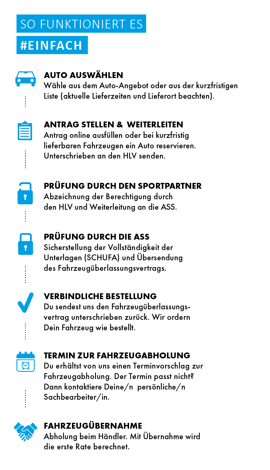 Seid ihr Bundeskader-, Landeskader- oder Vereinsathlet (bei U18-Athleten die Eltern), Trainer, Betreuer oder Kampfrichter? Dann einfach www.ichbindeinauto.de besuchen und im Antragsformular den HLV als Sportpartner auswählen! Der Antragsweg findet sich rechts.