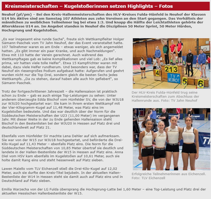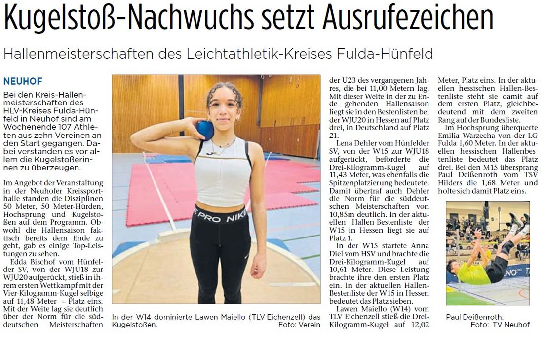 - Lena Dehler vom Hünfelder SV, von der W15 zur WJU18 hochgestartet, stößt die 3-Kilogrammkugel auf 11,43 Meter, Platz 1. Die Norm für die Süddeutschen Meisterschaften von 10,85m deutlich übertroffen. In der aktuellen Hallen-Bestenliste der W15 in Hessen auf Platz 1.