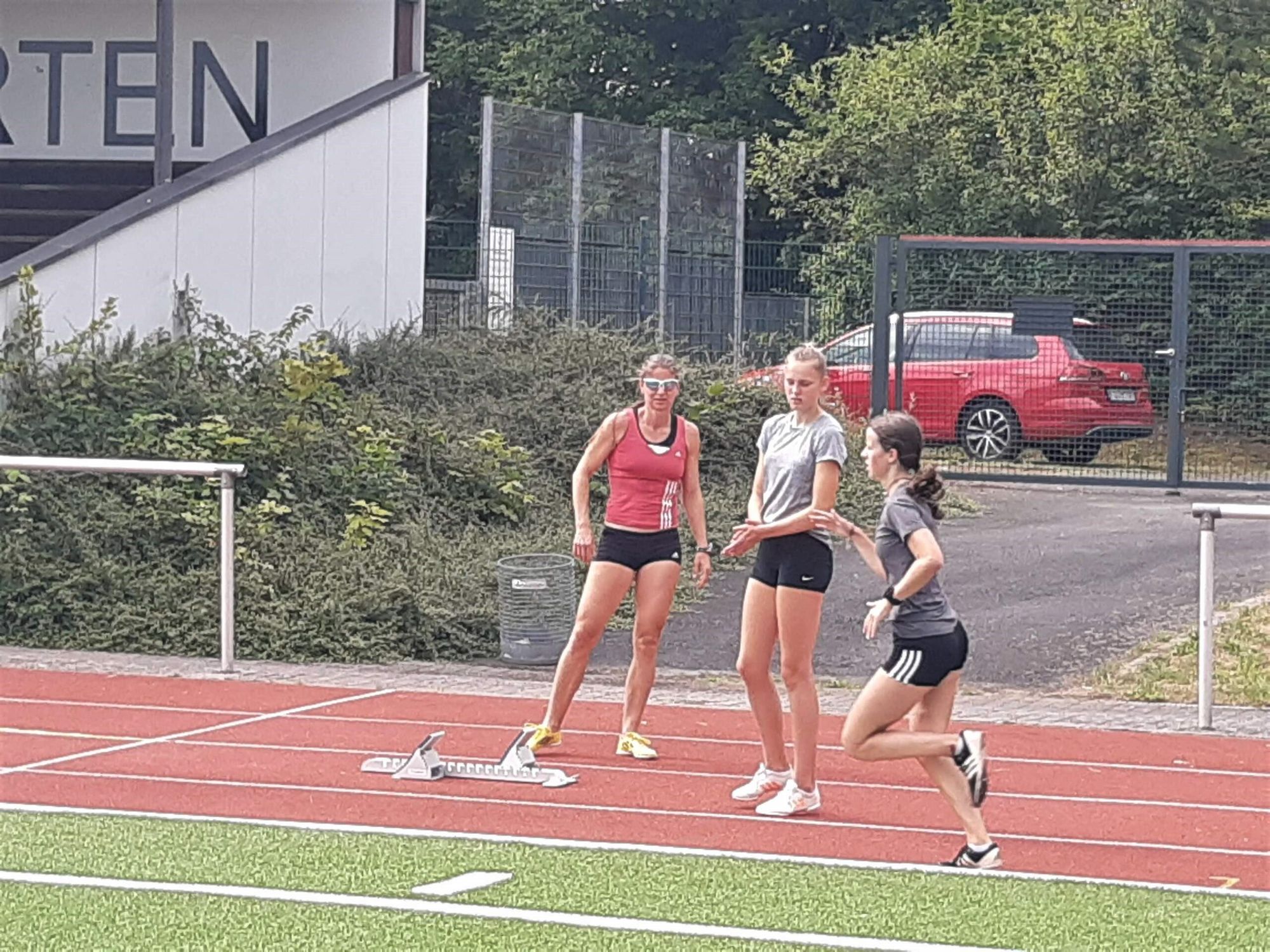 Ja, und da kommt dann schon mal das ein oder auch andere „Wow“ über die Lippen, wenn man Maren über die Hürden laufen sieht. Und Antonia und Finja haben dann auch gleich noch das Hürdentraining mit Maren mitmachen können. Ist schon schön für unsere Athleten, wenn sie im Training auch mal den Blick über den Tellerrand werfen können; mal sehen können wie international aktive Spitzenathleten trainieren. Nachwuchsathleten brauchen Vorbilder, müssen sehen können was durch gutes Training alles möglich ist, …! Und Maren ist ein exzellentes Beispiel dafür! Und das Maren immer wieder auf der Rhönkampfbahn trainiert ist um so schöner! Tja, die Trainingsmöglichkeiten auf der Rhönkampfbahn in Hünfeld sind nicht die schlechtesten!