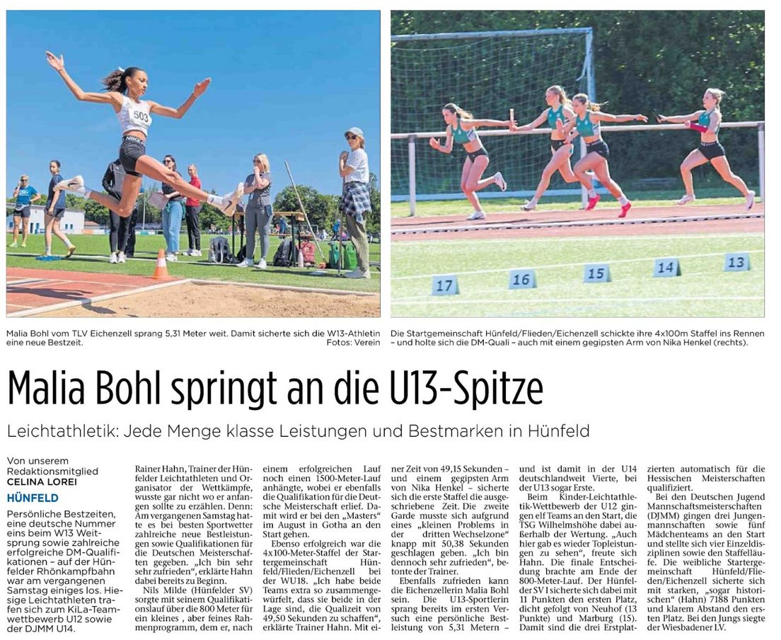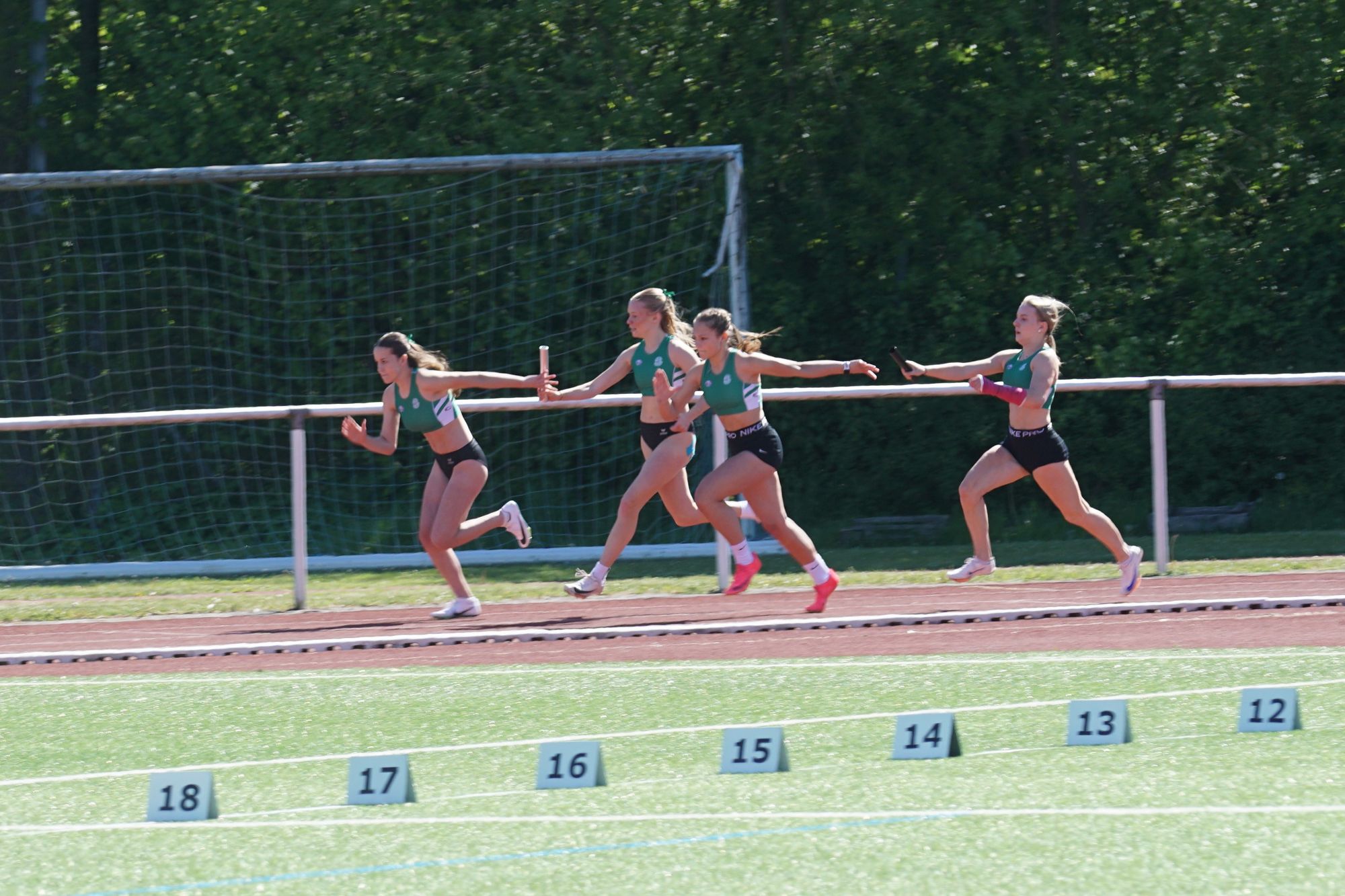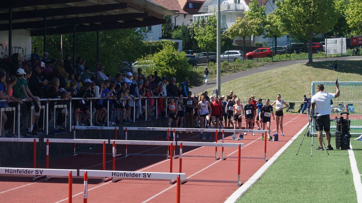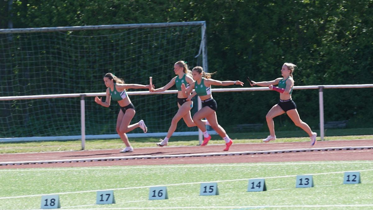 Das die U18-Mädels der Startgemeinschaft „Hünfeld-Fulda“ richtig schnell unterwegs sind, weiß man inzwischen. Ziel ist es, mit zwei Staffeln zu den Deutschen zu kommen! Dazu sind die beiden Staffeln so zusammengestellt worden, dass sie die Norm von 49,50 Sekunden jeweils schaffen können. In der heutigen Konstellation sind die Mädels aber auch noch nie zusammengelaufen. Beide Staffeln lieferten sich ein couragiertes Rennen. Die erste Staffel unterbot in 49,15 Sekunden die Norm deutlich. Und auch die zweite Staffel lieferte in 50,38 Sekunden ein TOP-Ergebnis ab! Wäre der dritte Wechsel nicht sprichwörtlich in die Hose gegangen. Die Schlussläuferin musste, um nicht außerhalb der Wechselzone den Staffelstab zu erhalten, ihre Geschwindigkeit voll rausnehmen. Wäre dieser Lapsus nicht passiert, wäre das auf der Zielgeraden ein sehr enges Ergebnis geworden. Aktuell stehen die beiden Staffeln der StG auf Platz 3 und 17 der Deutschen Bestenliste! In den U18-Staffeln aktuell ausnahmslos Mädels des Hünfelder SV!
