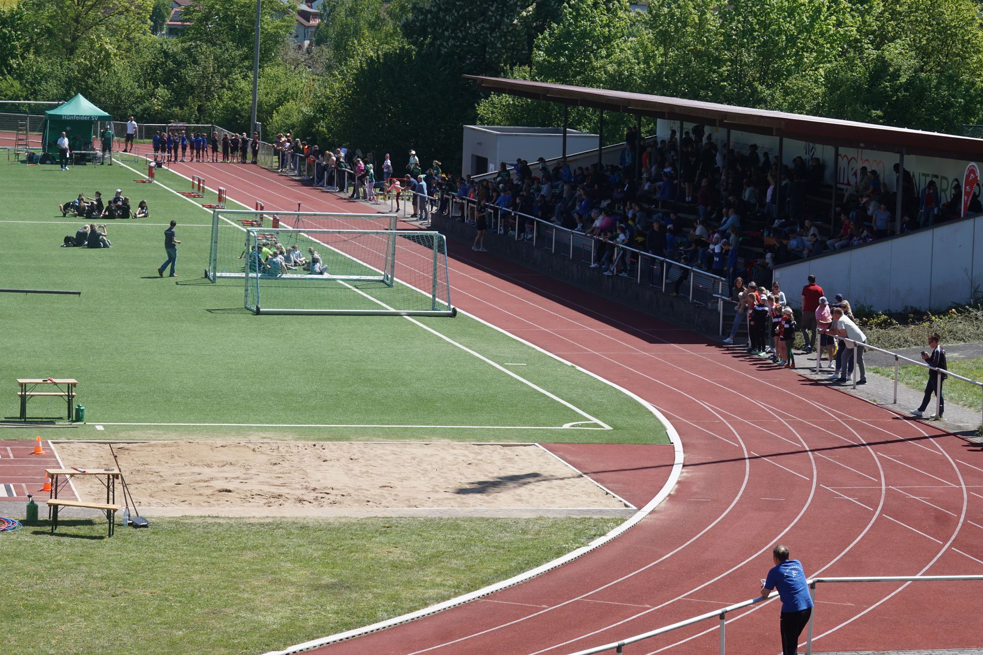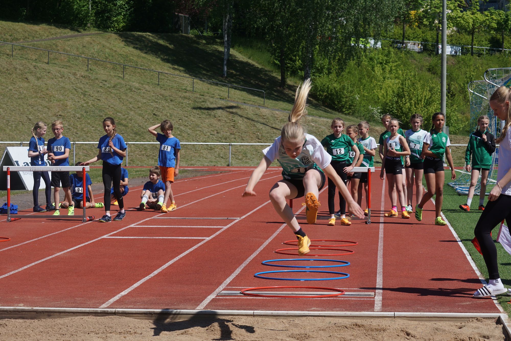 Der zweite Wettkampf des Tages war dann ab 14:00 Uhr ein „Landesoffener DJMM-Wettkampf U14“ (DJMM = Deutsche Jugend-Mannschaftsmeisterschaft). Auf dem Programm standen hier 75m, 800m, 60m Hürden, Hochsprung, Weitsprung, Ballwurf und dei4x75m Staffel. Je Einzeldisziplin können 3 Athleten starten sowie 2 Staffeln. Ein Athlet darf dabei nur 3 Mal inkl. der Staffeln zum Einsatz kommen. Gewertet werden je Disziplin die zwei besten Ergebnisse sowie die schnellere Staffel.