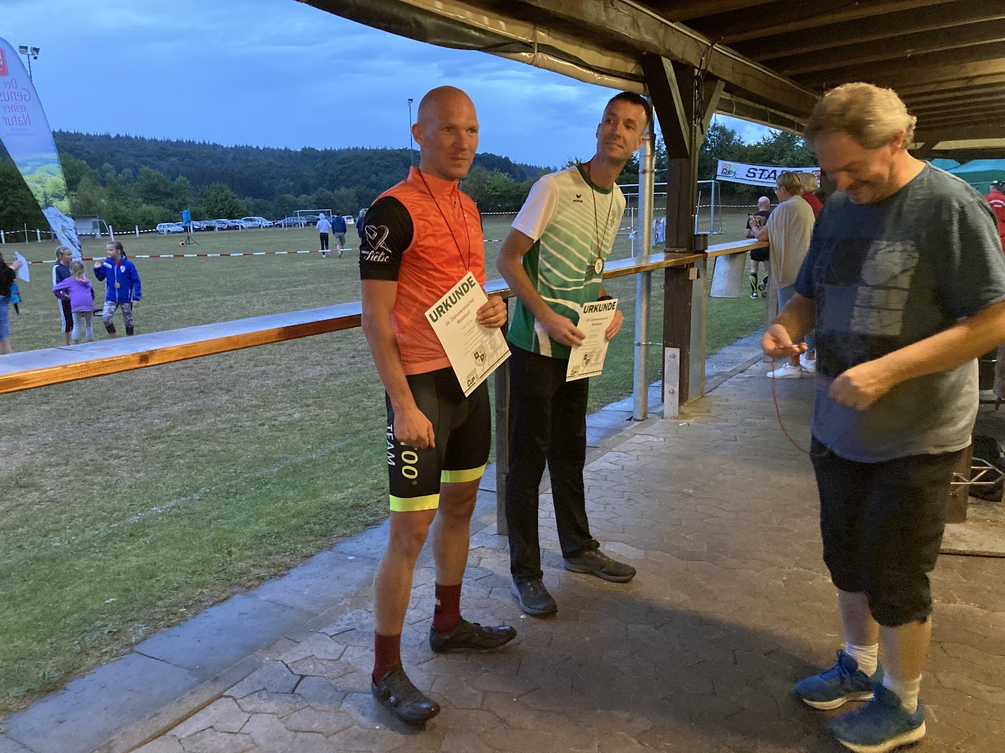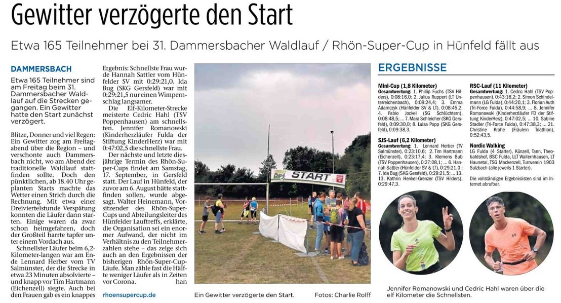 Der Dammersbacher Waldlauf hatte sich verspätet: Bei der Rhön-Super-Cup-Station am Freitagabend machte das Wetter den Teilnehmern beim Start einen Strich durch die Rechnung. Es ging mit einer guten Dreiviertelstunde Verzögerung los. Von 18.40 Uhr an sollten die Kleinen und Großen eigentlich auf die Strecke gehen, doch dabei zog ein Gewitter über den Dammersbacher Wald her. Es hieß Warten. Um 19.30 Uhr ging es dann endlich los. „Bei dem Gewitter können wir die Leute ja nicht losschicken“, sagte RSC-Vorsitzender Walter Heinemann, der sich aber freute, dass es dann doch noch klappte. Dennoch gab es vereinzelte Fluchten vor dem Regen: „Der eine oder andere Starter ist nach Hause gefahren“.
