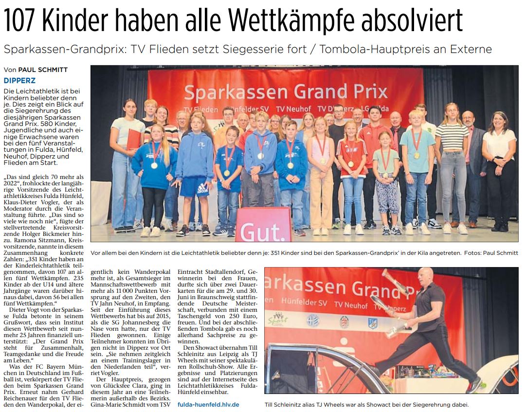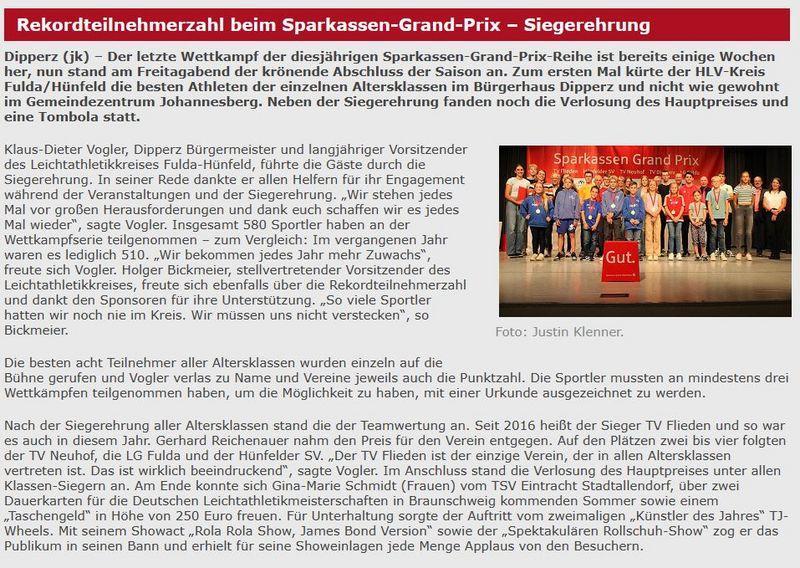 Der letzte Wettkampf der diesjährigen Sparkassen-Grand-Prix-Reihe ist bereits einige Wochen her, nun stand am Freitagabend der krönende Abschluss der Saison an. Zum ersten Mal kürte der HLV-Kreis Fulda/Hünfeld die besten Athleten der einzelnen Altersklassen im Bürgerhaus Dipperz und nicht wie gewohnt im Gemeindezentrum Johannesberg. Neben der Siegerehrung fanden noch die Verlosung des Hauptpreises und eine Tombola statt.