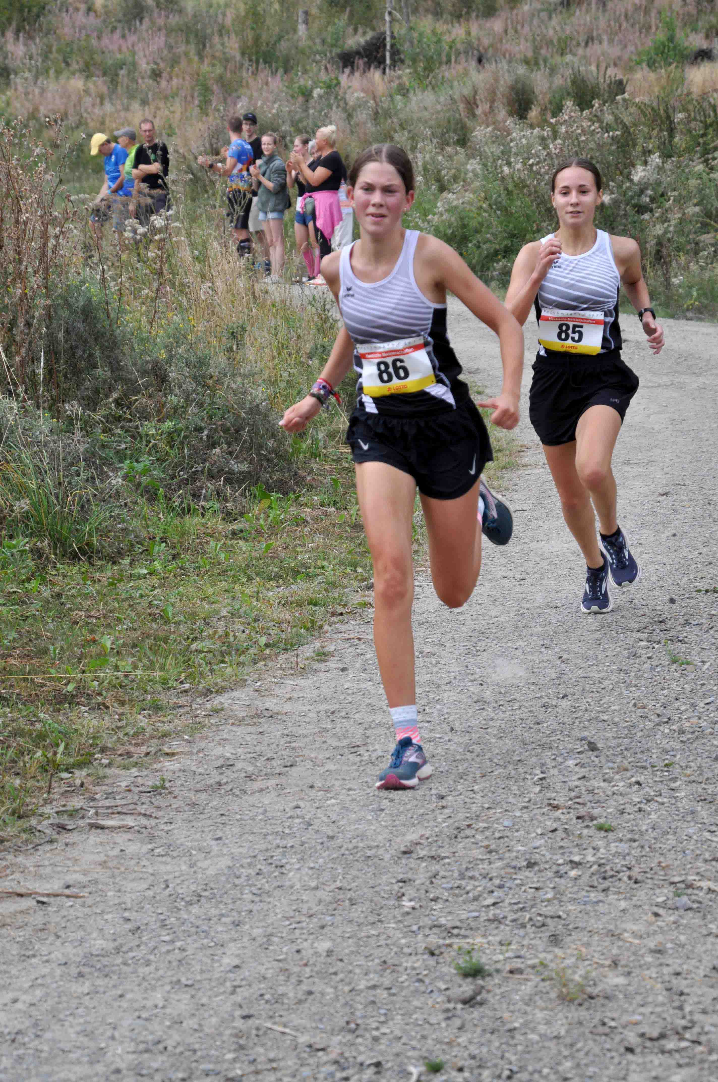 Durch Charlotte Weigand, W U20, kam der ASC zu einem weiteren Titel. Zweite wurde hier Marika Hack vom TSV Niederelsungen. In der W U18 ging der Titel an Teresa Dinges vom VfL1860 Marburg, die sich mit 80 sec. Vorsprung erfolgreich gegen die drei dann folgenden Läuferinnen des LC Marathon Rothenburg, Johanna Weber, Emily Harms und Marina Gnauert, durchsetzte. Letztere erhielten aber dann ihre Goldmedaille für ihren Mannschaftserfolg. Quasi Teresa vorgemacht hat es Laurenz Christian Steiß mit seinem Sieg in der M U18 in 43;18 min. Nur sechs Sekunden Rückstand hatte Tom Knauer vom SSC. Mit fast drei Minuten Abstand folgte der Drittplatzierte Yann-Hendrik Hopp in den Farben von Eintracht Frankfurt. Als einziger Repräsentant der TG Camberg vertrat Johann Escher als Sieger der M U20 seinen Verein in 43:16 min. würdig. Max Kleinschmidt, TSV Niederelsungen, kam als Zweiter ebenfalls auf fast drei Minuten Rückstand. Noch größer war die Zeitdifferenz des Drittplatzierten Lars Gerbig, LG Rüsselsheim, auch wenn sein Trainer spontan reagierte mit: "Dritter Platz - die Fahrt hat sich gelohnt!"
