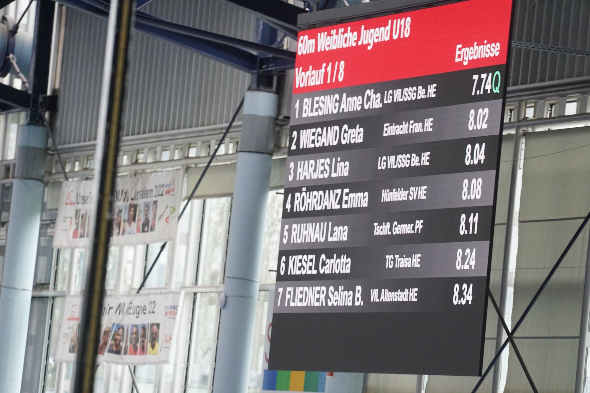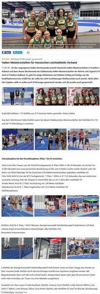 - Greta Lucia Ritz, Frauen (von der WJU20 hochgestartet, 8. Platz, 400m in 58,14 Sekunden, Im Vorlauf mit 57,88 Sekunden eine neue persönliche Bestleistung erzielt, und in beiden Läufen wieder deutlich unter der Norm von 58,60 Sekunden für die Deutschen U20-Hallenmeisterschaften geblieben, Hünfelder SV
