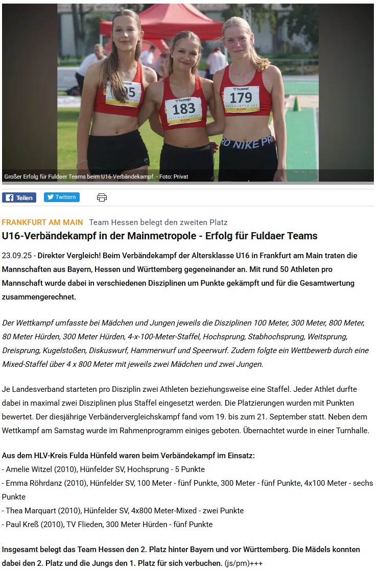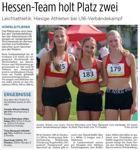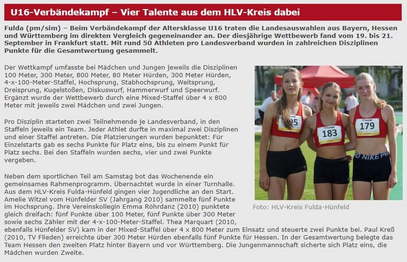 U16-Verbändekampf „Bayern – Hessen – Württemberg“ – Vier aus dem HLV-Kreis Fulda-Hünfeld mit dabei